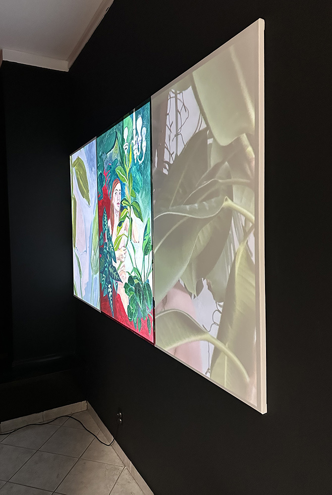 „Żywa natura z modelką” to pierwsza realizacja z cyklu „Artystka w Pracowni”. Praca jest reinterpretacją znanego z historii sztuki tematu Artysta w Pracowni. Motyw ten przedstawia artystę przy pracy i modelkę, która staje się atrybutem – obiektem reprezentującym profesję malarza. Jest to jednostronna hierarchiczna relacja. W mojej realizacji porządek ten zostaje zakłócony artystka jest tu jednocześnie: modelką i malarką, fotografką i performerką wchodzącą w przestrzeń jak w zastaną scenografię. Miejsce, w którym powstała „Żywa natura z modelką” to salon w moim mieszkaniu, nie jest to klasyczne pracownia tylko wielofunkcyjna przestrzeń do życia. Do obrazu razem ze mną pozują moje rośliny, zmieniając przestrzeń mieszkania w bloku w żywą przestrzeń wyobrażonej dżungli.